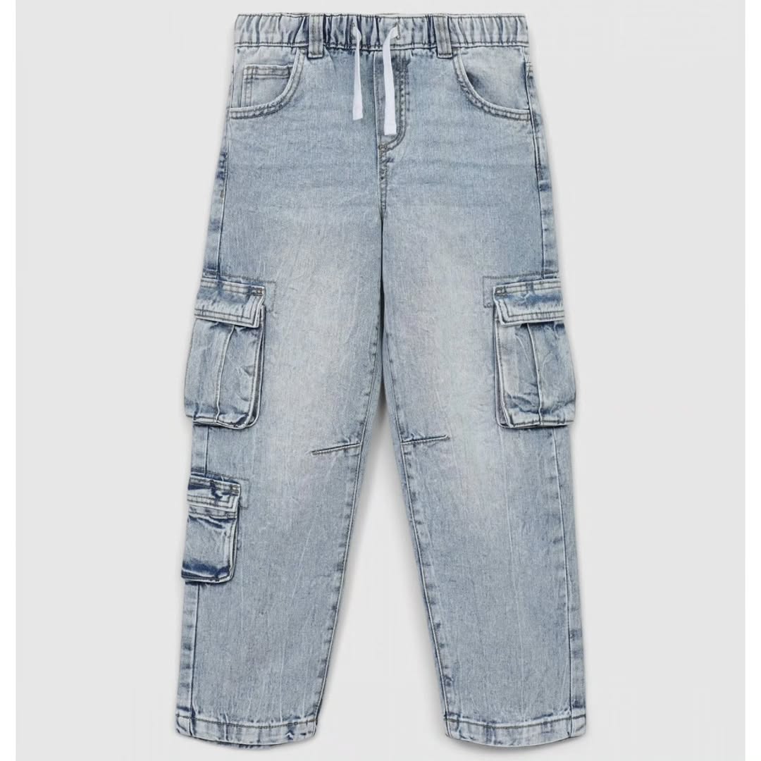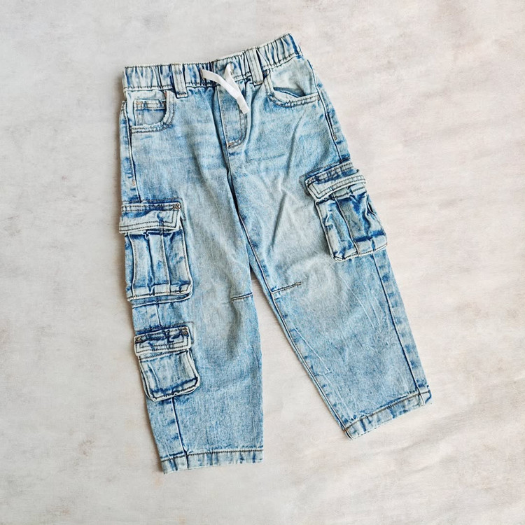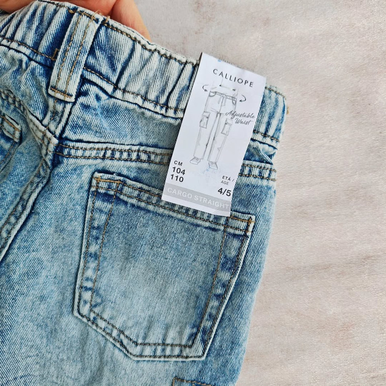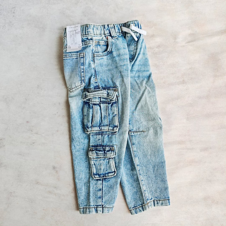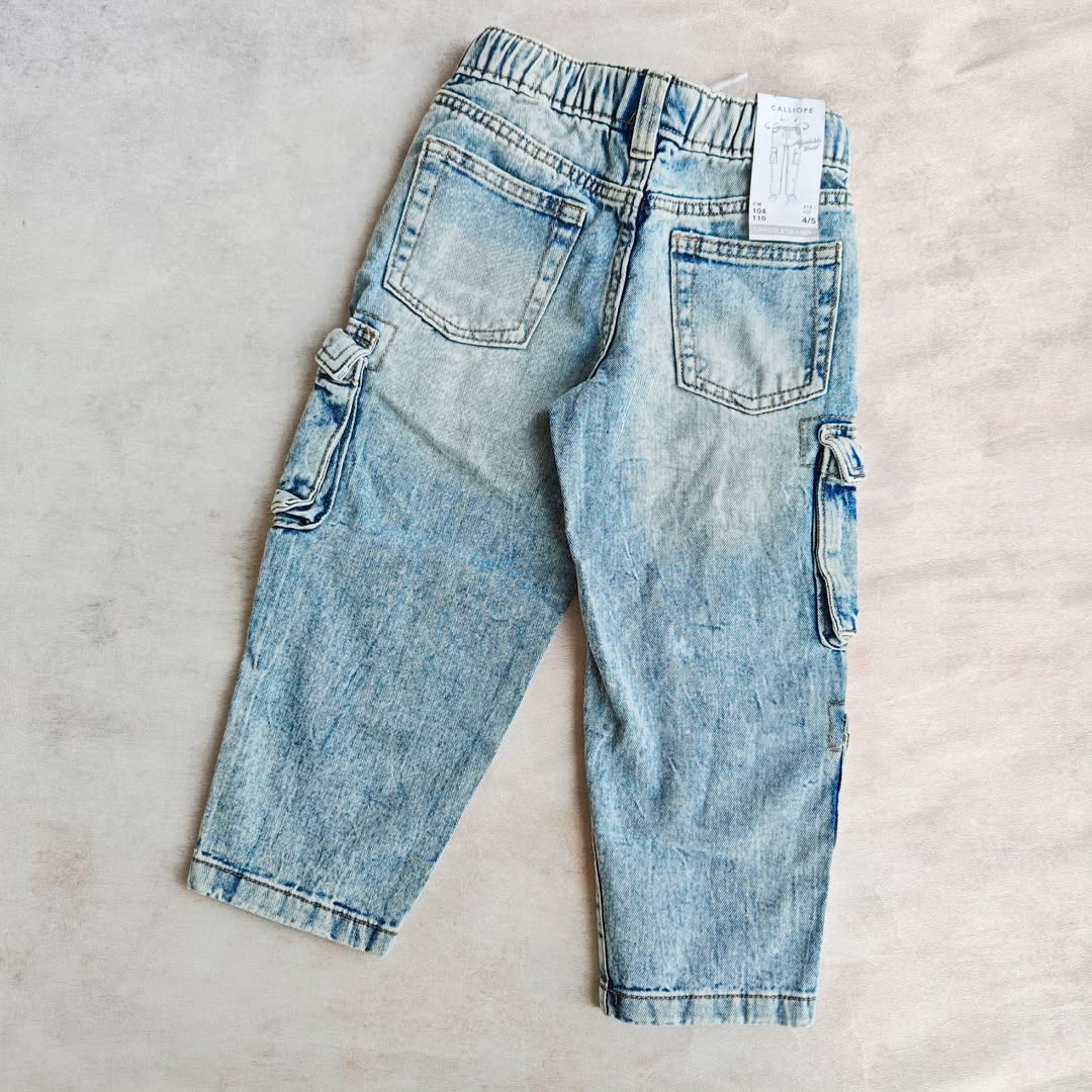 شلوار کارگو جین بچه گانه برند calliope رنگ آبی روشن سنگشور شده کمر کش با بند تنظیم